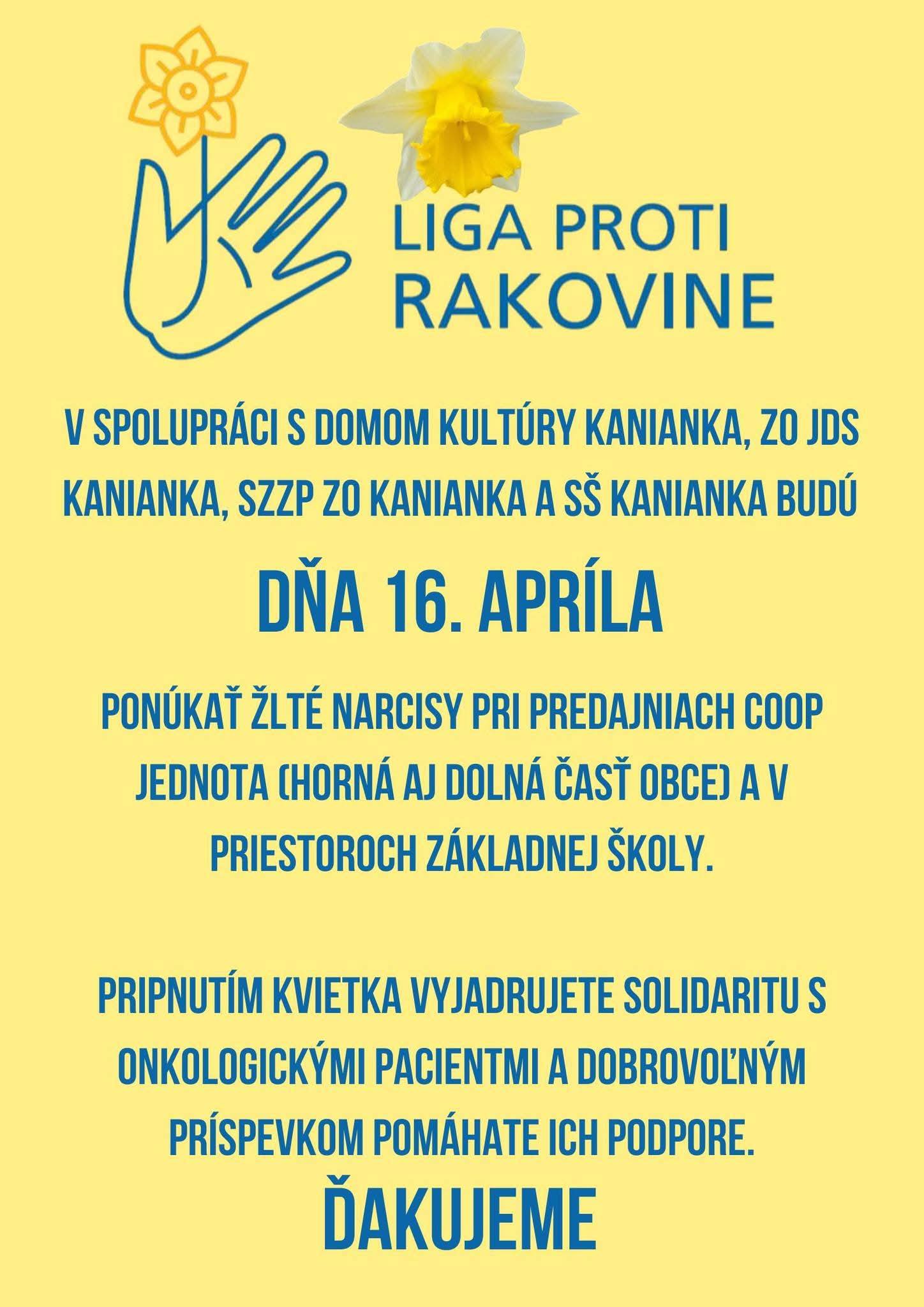 Milí občania, dňa 16.4.2026 sa uskutoční v obci Kanianka zbierka Ligy proti rakovine. Spolu s dobrovoľníkmi budeme rozdávať kvietky pri predajniach COOP Jednota (v hornej a dolnej časti obce)a v Základnej škole v Kanianke. Kto chce môže prispieť dobrovoľným príspevkom na podporu onkologických pacientov. Vopred ďakujeme všetkým darcom a dobrovoľníkom.