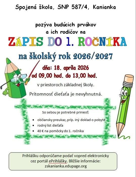 Všetky dôležité informácie a prílohy ohľadom zápisu do 1. ročníka nájdete v usmernení ministerstva školstva: usmernenie_k_zapisu_na_sk._rok_2026-27.pdf