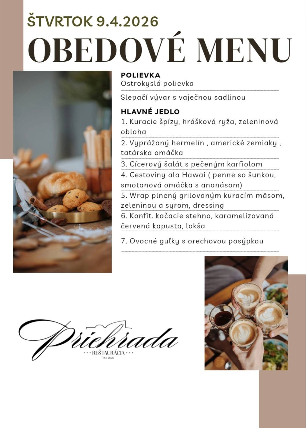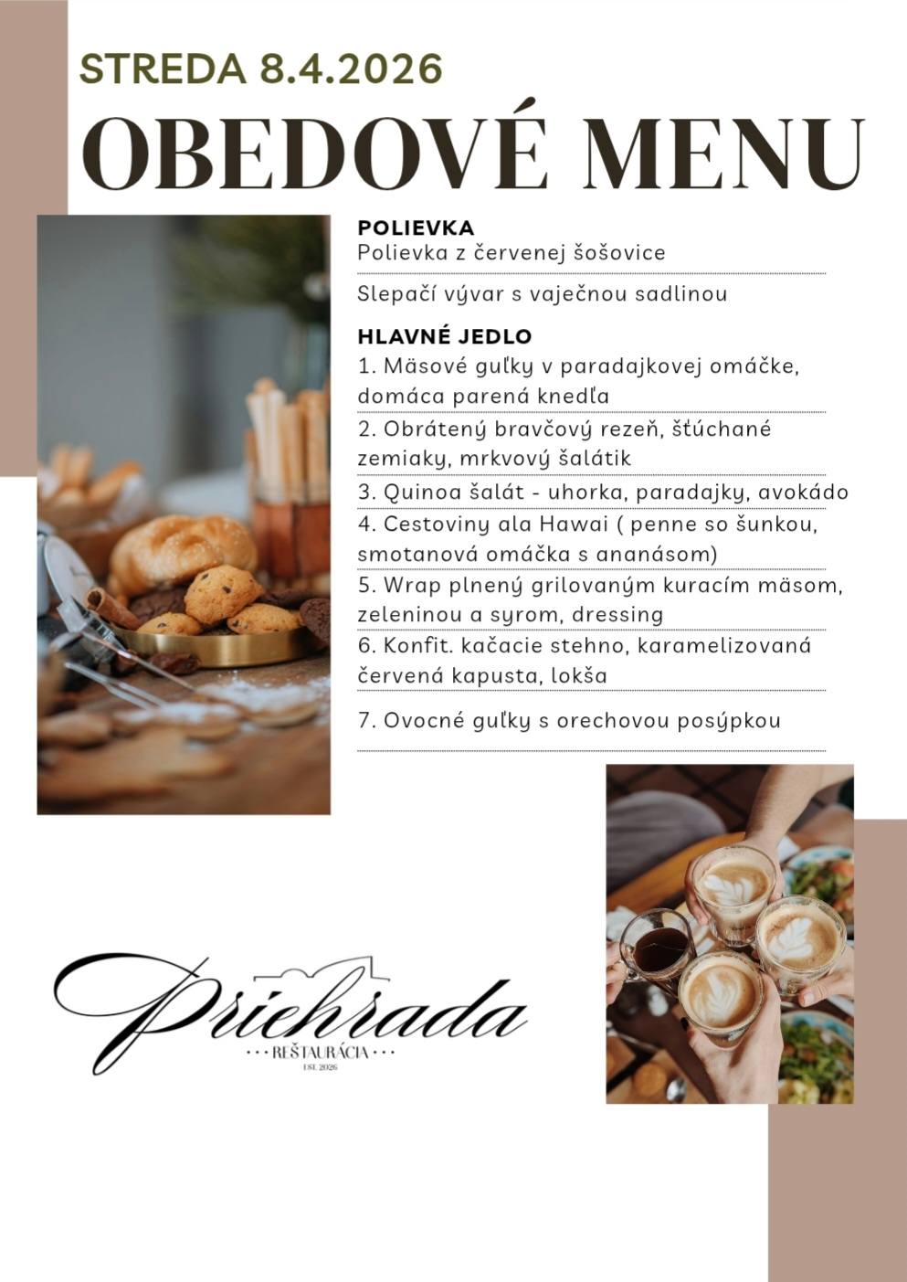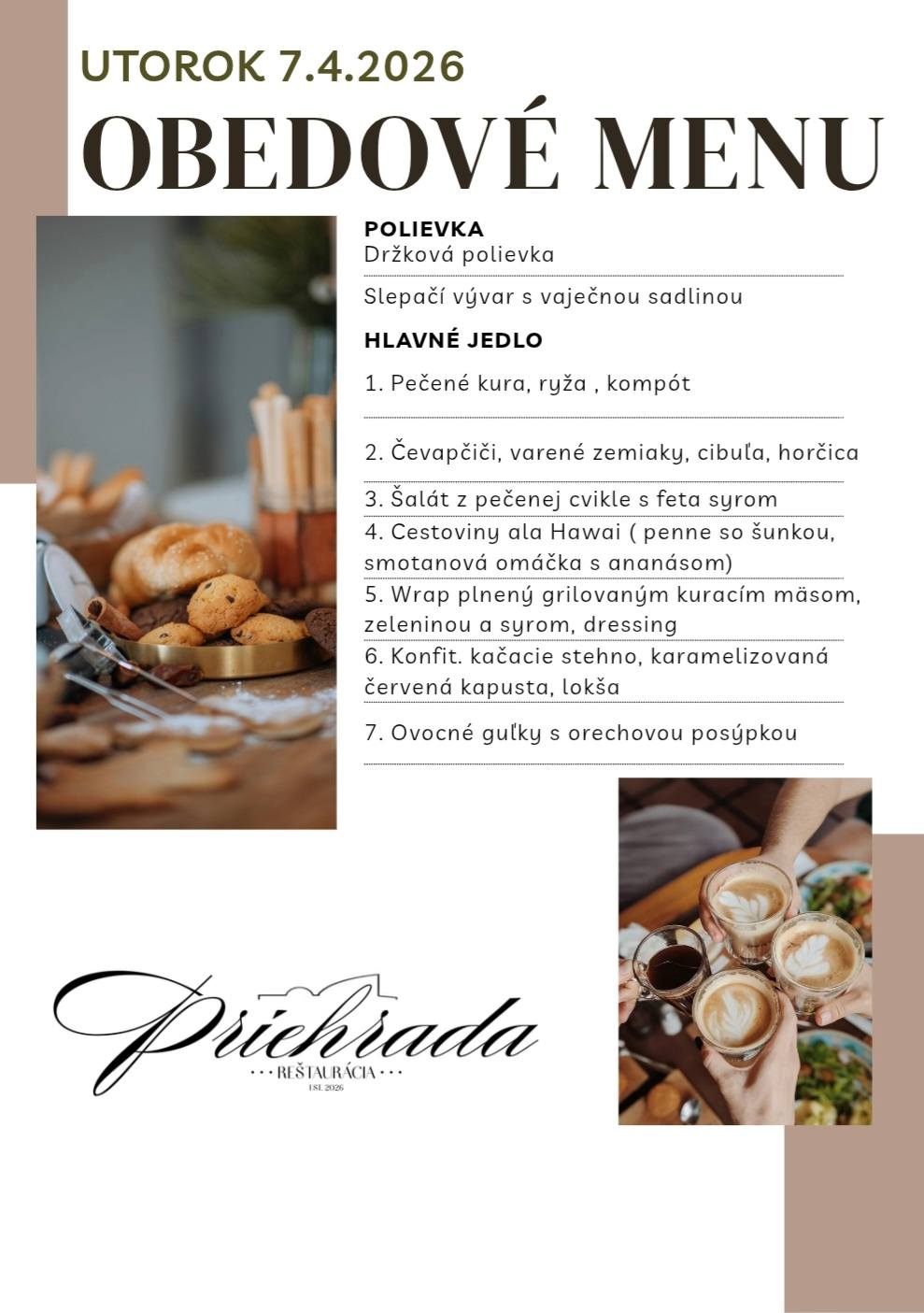 V dennej obedovej ponuke reštaurácie Priehrada si môžete vybrať zo siedmych jedál denne.