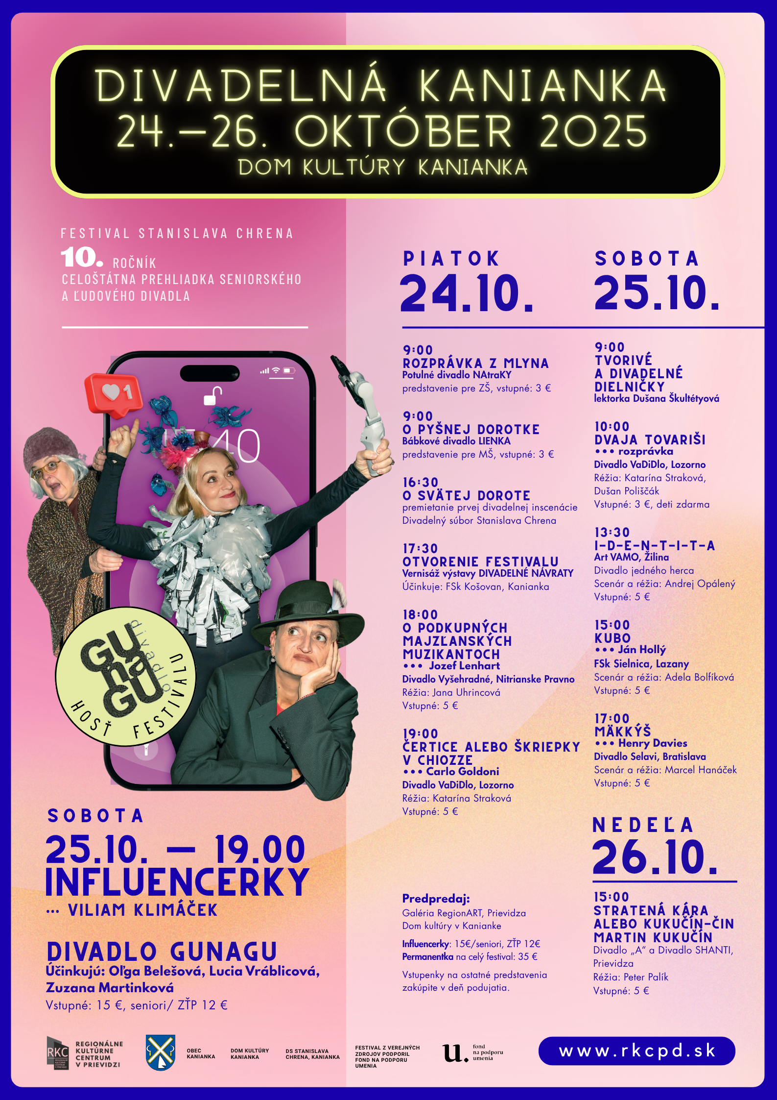 - 19:00 h – Hlavný hosť – Divadlo GUnaGU, Bratislava – INFLUENCERKY (Vstupné: 15 €, seniori / ZŤP 12 €)